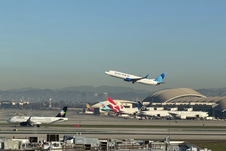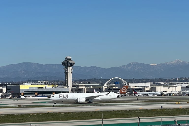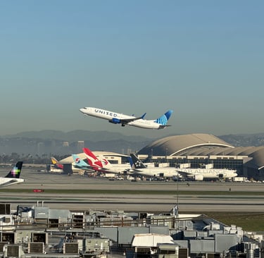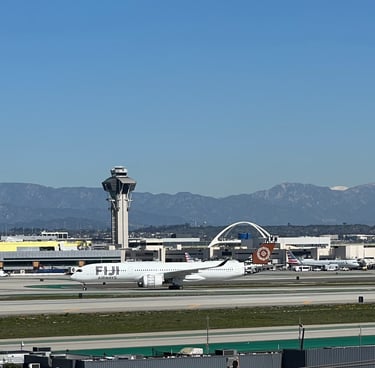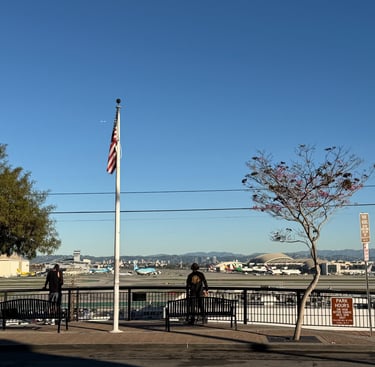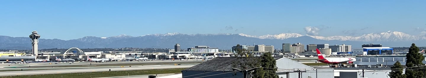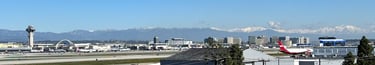 Views: Panoramic view of the south side of LAX, including excellent views of the Tom Bradley International Terminal, aircraft taxiing, and various ground operations. See Sofi Stadium, Century City, and snow capped mountains (in the winter) from here.